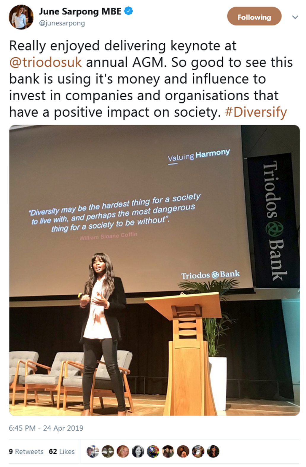 June also outlined simple steps to increase diversity within daily life and the workplace, saying that we should ask: “‘Is everyone in the room?’ And if they’re not, why not?”