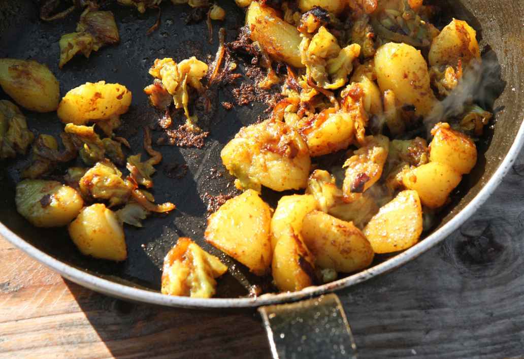 3. Add the potato chunks and cook for a few minutes, stirring often, until they start to colour. You may want to add a little more oil at this stage and you’ll probably need to use the edge of a spatula to scrape up some of the lovely crusty bits from the bottom of the pan.
