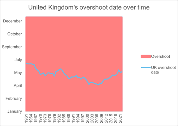 The graph below shows when the UK’s overshoot day took place based on consumption in each year since 1960. The closer the blue line is to the top of the graph, the later the overshoot day. The UK has been overshooting its fair share of biological resources since 1960 by a rather large margin, with the overshoot increasing until 2007. Since then, the overshoot day has moved back considerably. Whilst overshoot is still high, the direction of change is encouraging.